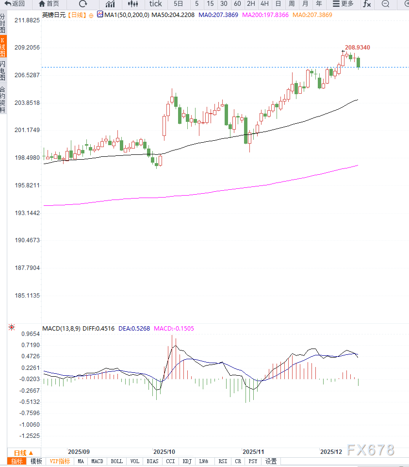 技术面显示,GBP/JPY短线偏空,若跌破207.00,回调空间或进一步打开。